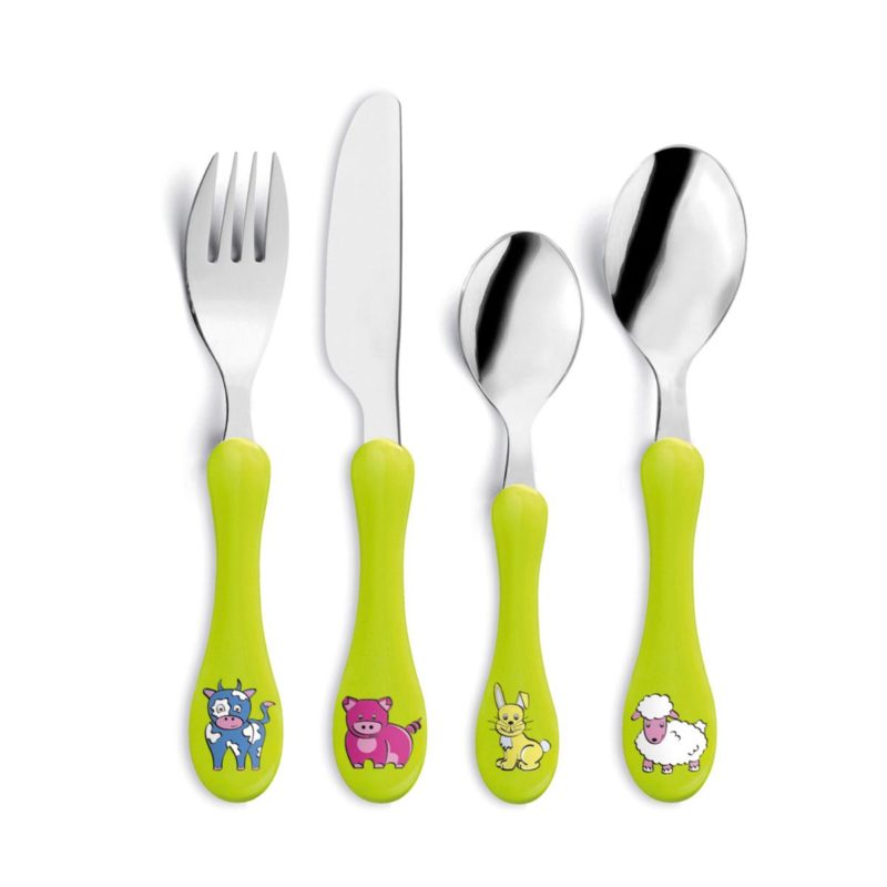La cubertería infantil Enfant de Amefa está compuesta por 4 cubiertos infantiles, 1 cuchara, 1 tenedor, 1 cuchillo y 1 cucharilla de postre de tamaño adaptado a las manos y bocas de los más pequeños. El set de 4 cubiertos infantiles Enfant está realizado en acero inoxidable de 1,5 mm de acabado brillante con mangos redondeados de plástico fáciles de sujetar por los niños y fáciles de limpiar ya que se pueden lavar en…