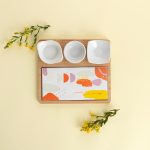 • La base está fabricada en madera de bambú, con una bandeja de cerámica incrustada y tres boles de cerámica en color blanco, cada uno con un diseño diferente.