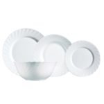 - La vajilla de 19 piezas Trianon de Luminarc es una vajilla de seis servicios compuesta por seis platos llanos de 24,5 cm, seis platos hondos de 22,5 cm, seis platos de postre de 19,5 cm y una ensaladera de 24 cm.