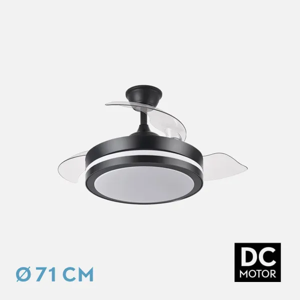 - Ventilador DC de la serie ESPARTA realizado en metal, policarbonato y ABS, en 3 colores, con tres aspas DESPLEGABLES de ABS transparente muy resistentes.