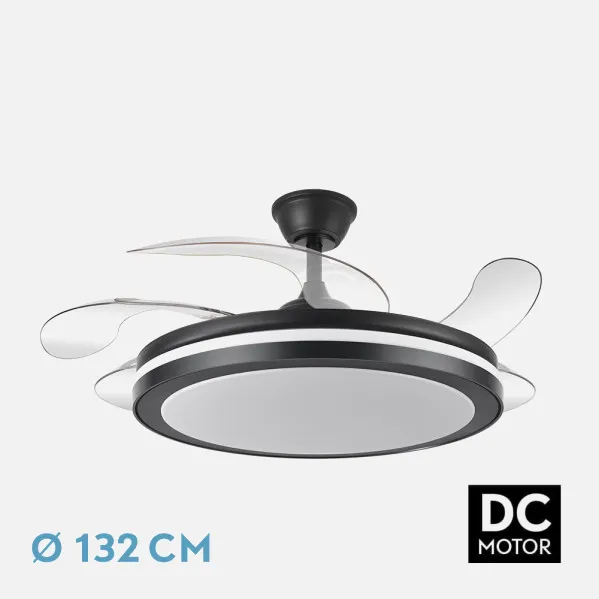 - Ventilador DC de la serie ESPARTA realizado en metal, policarbonato y ABS, en color BLANCO, NEGRO Y NIQUEL con tres aspas DESPLEGABLES de ABS transparente muy resistentes.