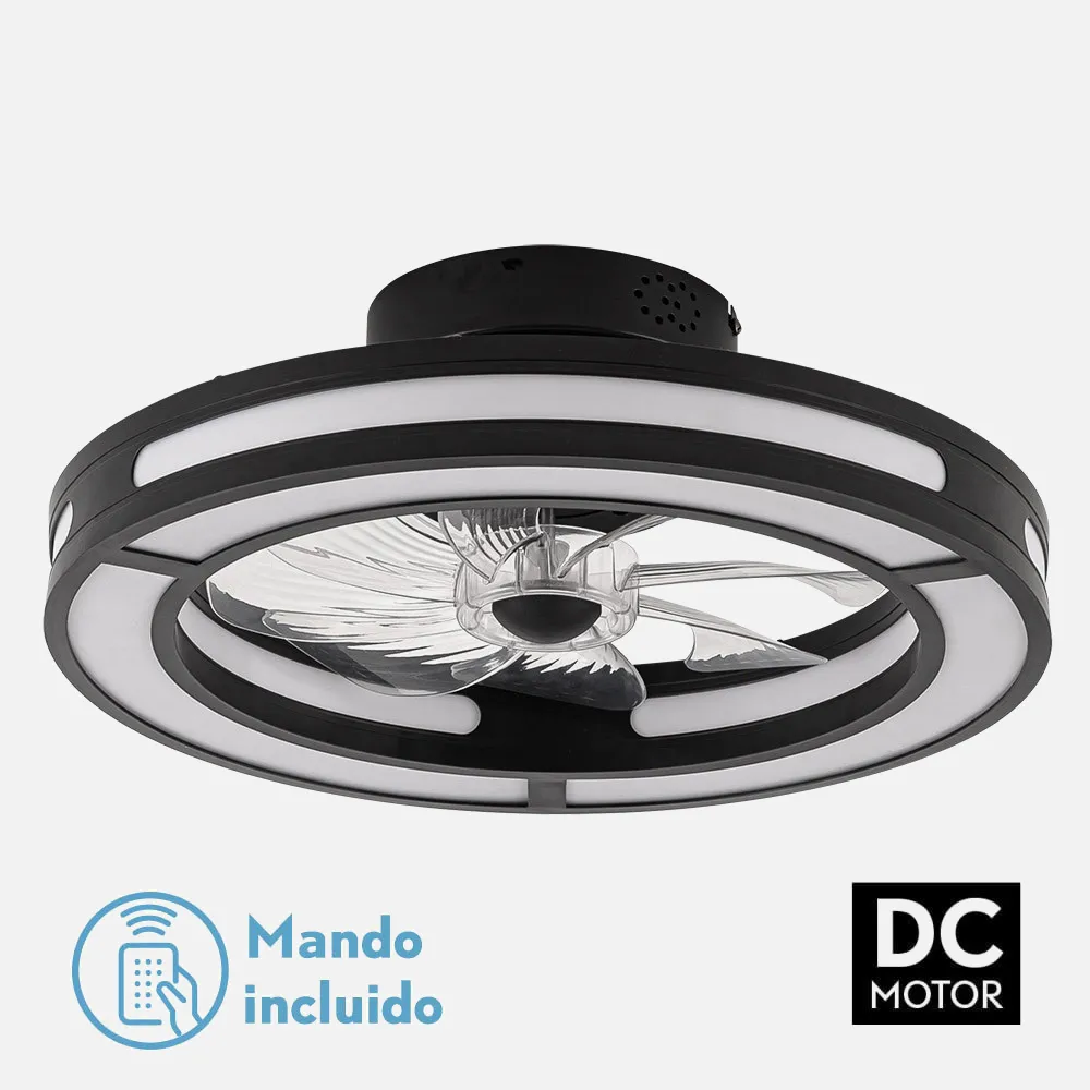 - Ventilador DC de la serie KASTORIA en color NEGRO, con ocho aspas transparentes y seis velocidades.